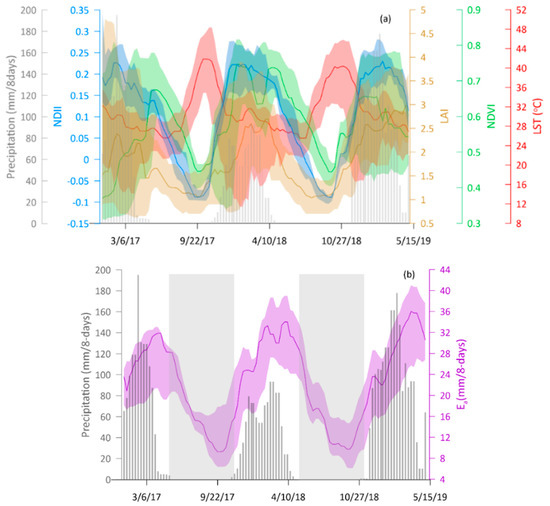 Canopy cover and water content were significantly higher during the rainy season, while canopy temperature was significantly higher during the dry season. Over the years, there appeared to be no significant difference in dry season canopy temperature. Across seasons, variations in canopy cover were more strongly associated with canopy water content than canopy temperature.