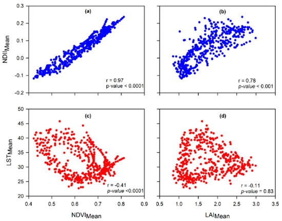 32] showed that during the dry season, with reduced canopy cover, the LST is higher than air temperature in African Savannah woodland. Furthermore, during the period of high moisture (i.e., rainy season) and high canopy cover maximum LST is almost 1:1 ratio with the maximum air temperature. The surface in the case of the Miombo Woodland would largely be the forest canopy. The discrepancy between LST and air temperature in the dry season could possibly render different results from those observed with the use of air temperature. This makes it necessary to understand the LST (as proxy for canopy temperature) interaction with canopy cover proxies such as the LAI and NDVI. Based on increased application of LST in vegetation monitoring and climate and hydrological modelling the use of LST to understand the canopy cover and canopy temperature relationship in the Miombo woodland could be a significant addition to the body of knowledge on the Miombo ecosystem.
