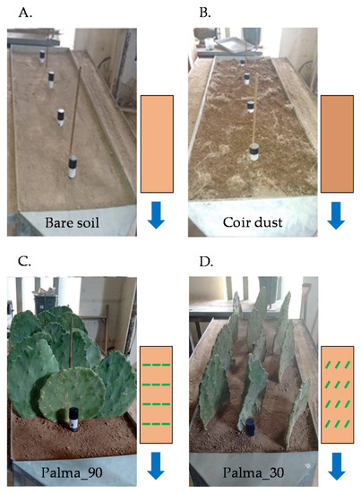 Four different soil cover conditions (Figure 2) were considered in this study: (i) One bare soil surface condition (Figure 2A), (ii) one mulch cover condition, with coir dust (Cocos nucifera L.) evenly distributed over the bare soil surface, at a density of 8 t ha−1 (Figure 2B) and (iii) two cover crop conditions with Palma cactus (Opuntia ficus indica Mill.) (Figure 2C,D).