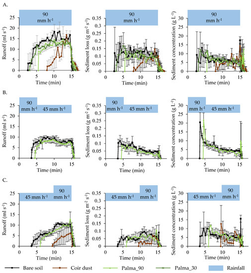 Graphs (mean and standard deviation of three repetitions) of runoff (left), soil loss (center) and sediment concentration (right) observed for all soil cover conditions and for the three rainfall patterns simulated in the experiments: (A) Uniform, (B) advanced and (C) delayed. No runoff and soil loss were observed for the coir dust and advanced rainfall pattern.