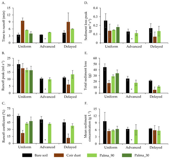 Bar graphs (mean and standard deviation of three repetitions) of parameters related to runoff and soil loss observed for all soil cover conditions and rainfall patterns simulated in the experiments: (A) Time to runoff, (B) runoff peak, (C) runoff coefficient, (D) soil loss peak, (E) total soil loss and (F) mean sediment concentration. For the coir dust and advanced rainfall pattern (*), no runoff and soil loss were observed at the downstream end of the flume and time to runoff was not measured.