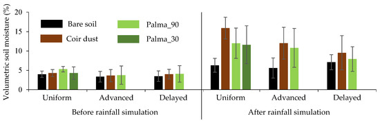 Bar graphs (mean and standard deviation of three repetitions) of volumetric soil moisture before and after rainfall simulation observed for all soil cover conditions and rainfall patterns.