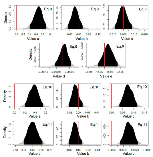 High posterior density (HPD) distributions of the 1000 values of each regression coefficient of Equations (9)–(14) during the random cross-validation nonlinear regression (RCV-NLR) calibration procedure (when the red line is in the black area, the coefficient and the respective model is not robust).