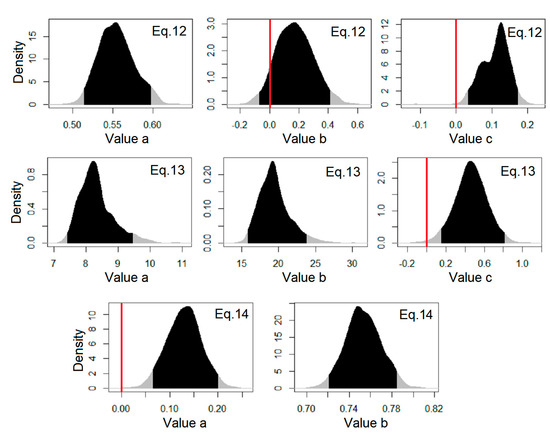 The minimum, mean, maximum, and 2.5% and 97.5% HPD thresholds of the regression coefficients of Equations (9)–(14) derived by the RCV-NLR analysis during calibration are provided in Table S2 (Supplementary Materials). The HPD distributions of the regression coefficients based on their 1000 values are given in Figure 1.