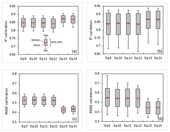 Range of (a,b) R2 and (c,d) root mean square error (RMSE) during calibration and validation of the six models (Equations (9)–(14)) presented as modified box-whisker plots, with boxes adjusted to the 95% HPD interval.
