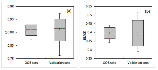 Range of (a) R2 and (b) RMSE of the Out-of-Bag (OOB) and validation sets of the multiple random forests (MRF) analysis presented as modified box-whisker plots, with boxes adjusted to the 95% HPD interval.