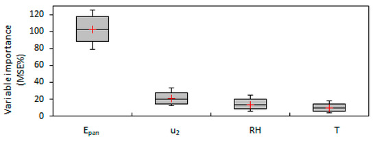 The respective modified box-whisker plots of the variables’ importance are also provided in Figure 4 and their respective values in Table S5 of the Supplementary Materials. Based on Figure 4 and Table S5, the importance of the variables follows the order Epan > u2 > RH > T, with the MSE% values of Epan being at least five times greater than the rest of the parameters.