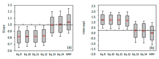 Range of (a) slopes and (b) intercepts of the trend lines of observed vs. predicted ETo values from 1:1 plots using all the validation cases from the RCV-NLR analysis of Equations (9)–(14) and MRF presented as modified box-whisker plots, with boxes adjusted to the 95% HPD interval (optimum slope equal to 1, and optimum intercept equal to 0; 1:1 plots were constructed with observed values at the vertical and predicted values at the horizontal axis).