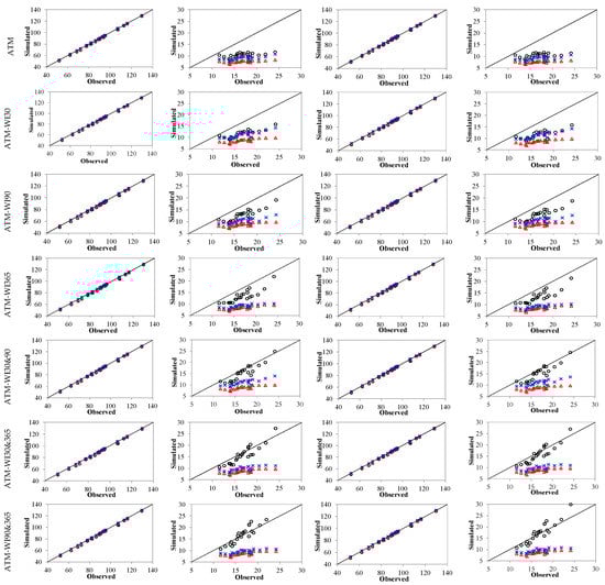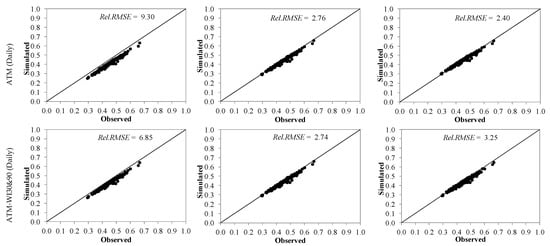 Sustained wet and dry periods are of prime concern in catchment management studies. Table 4 presents the station averaged results of observed and models simulated dry and wet spells of varying durations produced by three downscaling techniques for both calibration and validation time periods using a selected dataset (ATM-WI30&365). As mentioned above, a day is classified as wet if daily rainfall is greater than or equal to 0.3 mm, thus a wet spell is defined as the continuous sequence of days with daily rainfall greater than or equal to 0.3 mm. Similarly, a dry spell is defined as the sequence of days with daily rainfall less than 0.3 mm. At site statistics in the form of scatter plots are presented in Figure 6 for both calibration and validation time periods and for three datasets. MMM provides the most accurate simulation of these statistics for all datasets and for both calibration and validation time periods by having accurate fit and minimum Rel. RMSE (Figure 6 and Table 4). Models, in general, overestimate the number of dry spells of 2–9 and 10–18 days while underestimate the number of dry spells of >18 days (Figure 6). It appears that the inclusion of 30 days WI helps maintaining wet and dry spells related characteristics in the downscaled sequences in a better way. The extreme wet and dry spells (>7 days and >18 days, respectively) are intrinsically rare events (on average, occurring once in every two seasons) and improved performance of MMM is an indication of the capability of model for use in water resources related applications.