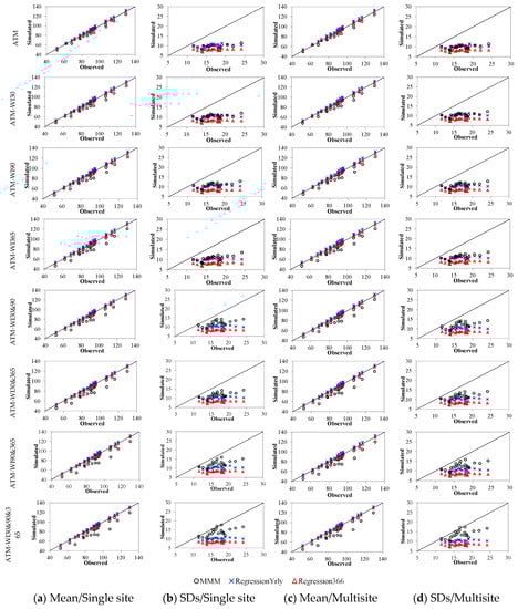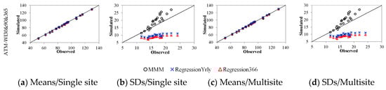 Scatter plots of means and standard deviations of observed and simulated annual wet days at each rainfall station for validation: (a) means using single site simulations; (b) standard deviations using single site simulations; (c) means using multisite simulations; and (d) standard deviations using multisite simulations. Each dot on the plot represents a station. Black hollow circles are for MMM, blue crosses are for RegressionYrly and red triangles are for Regression366 models.