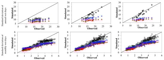 Similar to the calibration case, Figure 9 and Figure 10 present scatter plots of observed and models simulated cross correlations of daily, monthly and annual wet days using three predictor sets, for single site and multisite cases, respectively, for the validation time period. All single site models, irrespective of predictor sets, perform poorly at daily and annual time scales. This is because the single site model ignores the spatial dependence across stations in the downscaled simulations. At monthly time scale Regression366 model with either predictor set performs better in comparison to remaining two models (Rows 4–6, Figure 9). For multisite case, all models perform well at daily and monthly time scale by repeating the calibration results. At annual time scale, all models with either predictor set fail to reproduce the observed spatial dependence behavior. It appears that the univariate nested bias correction ignores the spatial dependence and cross variable dependence aspects and use of a multivariate bias correction approach, as described by Mehrotra and Sharma [,,], might improve the behavior. As annual cross correlations play a major role during the planning, design and operation of manmade components of hydrosystems, their accurate simulation is important.