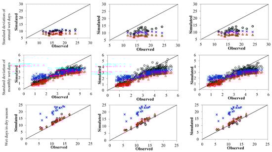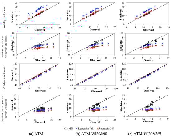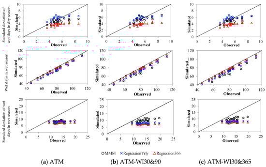 Multisite model results simulated by all downscaling techniques for validation: (a) using ATM as predictors; (b) using ATM-WI30&90 as predictors; and (c) using ATM-WI30&365 as predictors. Each dot on the plot represents a station. Black hollow circles are for MMM, blue crosses are for RegressionYrly and red triangles are for Regression366 models.