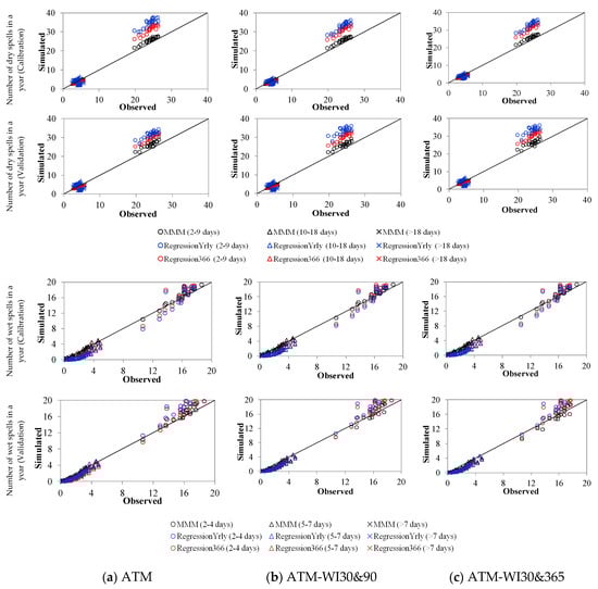 Number of dry and wet spells in a year at each of 22 rainfall stations for calibration and validation periods using the multisite downscaling model: (a) using ATM as predictors; (b) using ATM-WI30&90 as predictors; and (c) using ATM-WI30&365 as predictors. Dots on the plots represent stations. Black dots are for MMM, blue dots are for RegressionYrly and red dots are for Regression366 models.