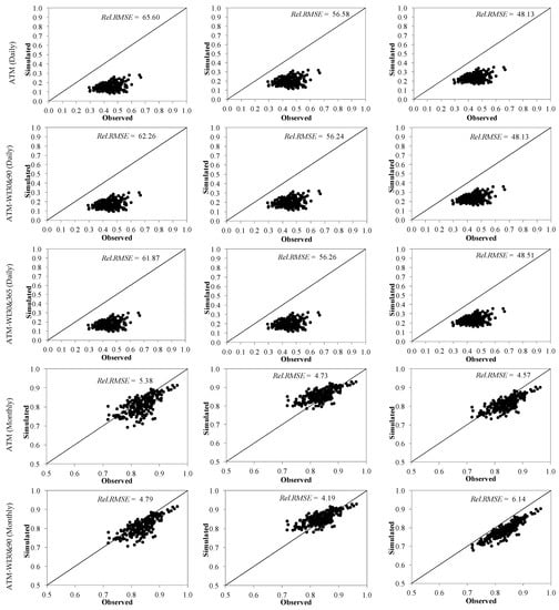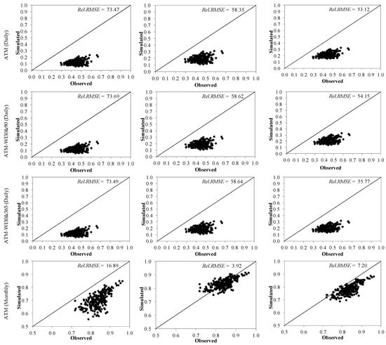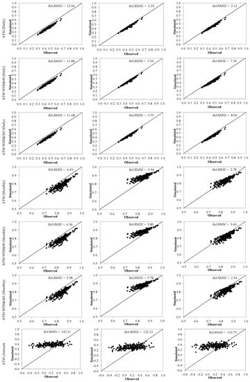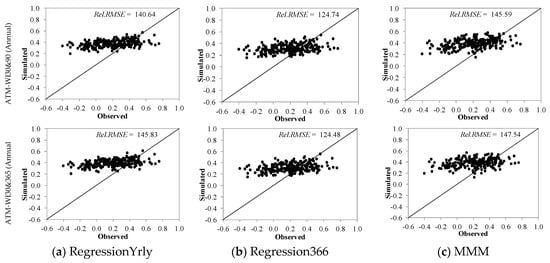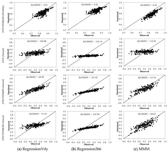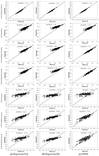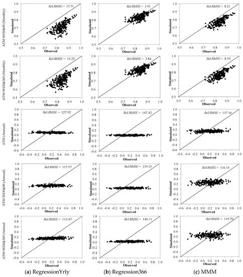 Scatter plots of observed and models simulated daily, monthly and annual cross correlations using single site model (Validation period). Rel. RMSE values are shown on the top right of each plot: (a) using RegressionYrly model; (b) using Regression366 model; and (c) using MMM.
