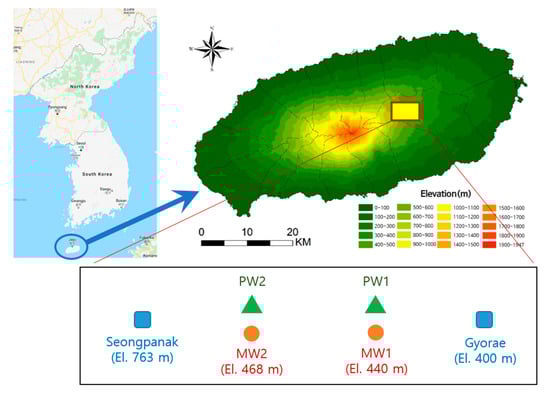 The study area comprised of two groundwater monitoring well points located in the central mountainous region of Pyoseon watershed in the southeast portion of Jeju Island (Figure 1). This study used daily precipitation data from the Seongpanak and Gyorae rainfall stations in the vicinity of groundwater monitoring wells, daily groundwater withdrawal data from two groundwater pumping wells (pumping well 1 (PW1) and pumping well 2 (PW2)), and daily groundwater level data from two groundwater monitoring wells (monitoring well 1 (MW1) and monitoring well 2 (MW2)) (Table 1). Data from the Seongpanak rainfall station (automatic weather station), which is operated by the Korea Meteorological Administration (http://www.weather.go.kr/), and Gyorae rainfall station, which is operated by the Jeju Island Disaster and Safety Countermeasures Headquarters (http://bangjae.jeju119.go.kr/), are provided online. The withdrawal data of the pumping wells and the groundwater level data of the monitoring wells were observed and operated by the Jeju Province Development Corporation. The locations of rainfall stations, groundwater pumping wells, and groundwater monitoring wells in the study area are shown in a diagram (Figure 1). Precipitation at the rainfall stations and groundwater level in the monitoring wells are shown in Figure 2 and Figure 3, respectively. In Figure 2, the precipitation at the Seongpanak rainfall station is greater than that at the Gyorae rainfall station. Accordingly, the Seongpanak rainfall station (El. 763 m, Figure 1) is located at a higher elevation than the Gyorae rainfall station (El. 400 m, Figure 1), and the former is more affected by the orographic lift effect than the latter, resulting in greater precipitation. In Figure 3, the degrees in groundwater level variation of MW1 and MW2 are similar; however, the groundwater level of MW1 is higher than that of MW2.