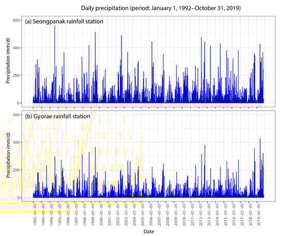 Comparison of daily precipitation in Seongpanak and Gyorae rainfall stations.