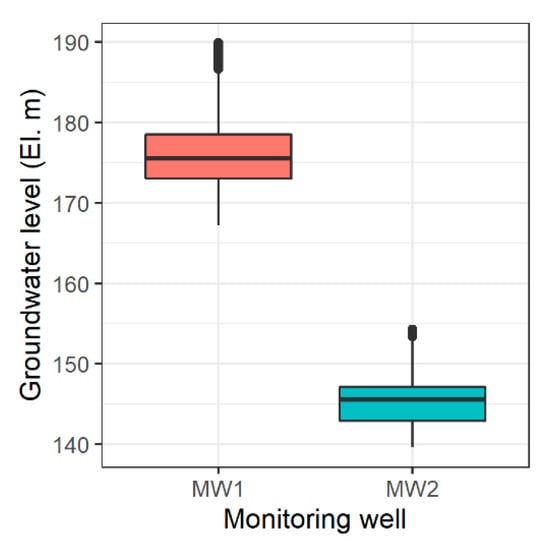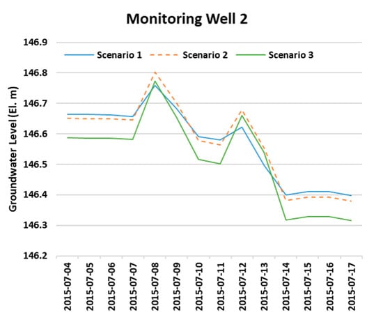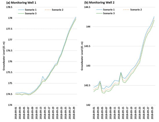 Figure 8 shows the representative section (1–30 September 2018) of the simulated groundwater level variations according to the change in the withdrawal amounts for MW1 and MW2. As expected, the groundwater level was highest for Scenario1 with no withdrawal, followed by Scenario2 (withdrawal of 1533 m3/d) and Scenario3 (withdrawal of 2300 m3/d).