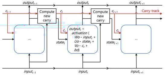 Long Short-Term Memory [15] is a modification of the RNN developed to solve the vanishing gradient problem [17], which makes it impossible for RNN to learn long-term dependencies. LSTM uses a conveyor belt (carry track, Figure 4) placed parallel to the sequence being processed so that the information from the sequence can be transported to the carry track at any point in time and then transported to a later time to be reused when needed. The information is stored in a carry track for later use, and therefore, there is no problem if the old signal gradually disappears during the calculation process [26]. LSTM was developed to remember long-term information and has a recurrent structure similar to the existing standard RNN, but the former differs from the latter in that it learns long-term information using four unique transformations. First, the output of the cell for time t () is calculated as follows: