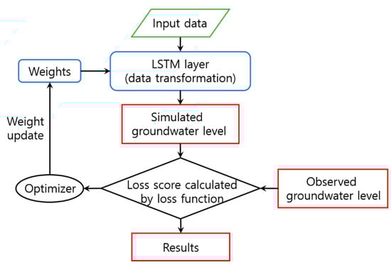 Figure 5 shows LSTM’s supervised learning procedure. The data input to the layer of the LSTM is converted by weights that are parameters of the layer. The groundwater level simulated by LSTM is compared with the observed groundwater level using the objective function (here loss function), and the weights are adjusted (updated) through the optimizer until the simulated groundwater level is closest to the observed groundwater level (i.e., until loss is minimized). The process of gradually adjusting the weights is called training, and LSTM is learned through training. Therefore, the weights contain the learned information, and the optimizer uses the backpropagation algorithm. In this study, LSTM included in the Keras package [27], which is an R language-based deep learning framework, was used.