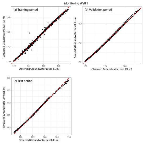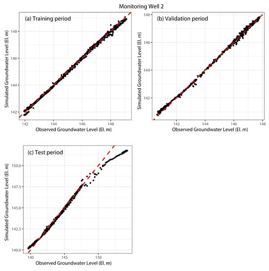 Figure 6 and Figure 7 show the one-day prediction performance of the groundwater level by LSTM for the training, validation, and test periods of MW1 and MW2, respectively. In the figures, the horizontal axis represents the observed groundwater level, the vertical axis represents the simulated groundwater level, and the red dashed line represents the one-to-one line.