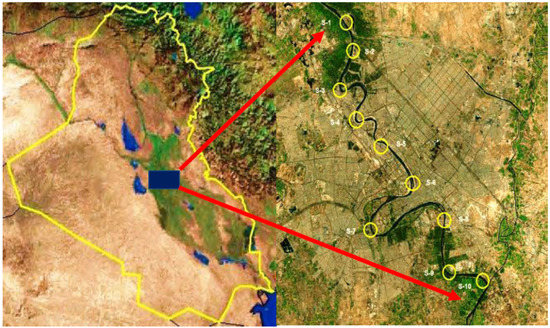 Due to its significant hydrological environment, location, and data availability, the Tigris River is chosen as a case study area. On both sides of the Tigris there are many cities, the most prominent of which is the Iraqi capital Bagdad. The river bisects the capital Baghdad, populated by about 7 million people, for a total of approximately 50 km [11], (Figure 1).