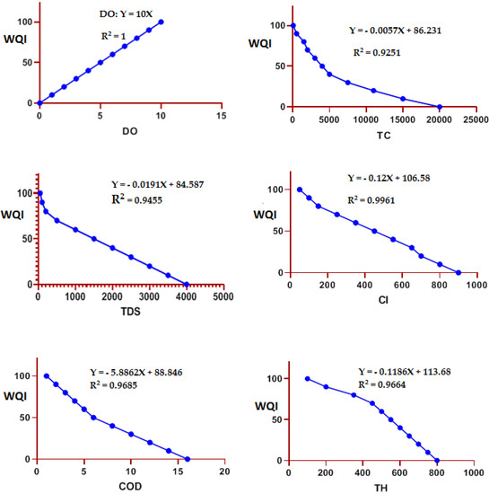 The development of sub-indices function by the weighted sum index method using the proposed categories values of different water quality classifications (Table 3) was plotted as water quality curves. A set of average curves—one for each parameter representing the variation in the level of water quality produced by the various possible measurements of each respective parameter—is drawn, with levels of (water quality) from 0 to 100 on the vertical axis, while various levels of the parameter were set along the horizontal axis, as shown in Figure 2.