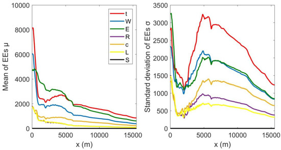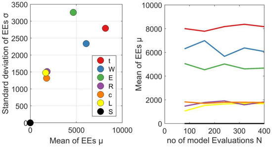Metric of influence (mean of EEs) and metric of nonlinearity (standard deviations of EEs) (left); mean of EEs with respect to the evaluation number (right).