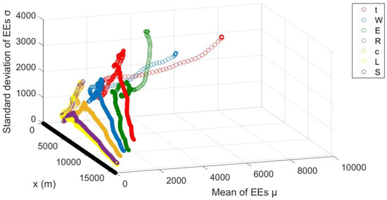 A merged 3D plot: distance (x axis), mean of EEs (y axis), standard deviations of EEs (z axis) for maximum water depths.