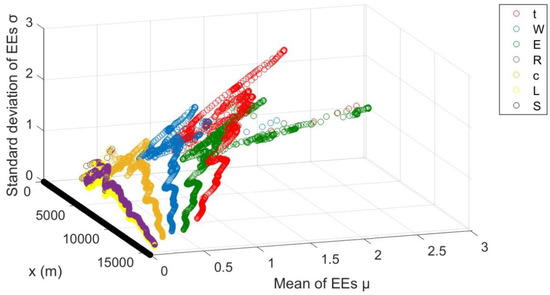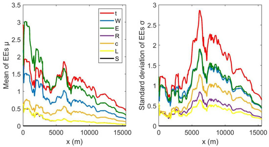 Regarding the nonlinearity effects, it seems that in general there was a decreasing trend in space and besides, it was correlated with the sensitivity: the bigger the sensitivity, the stronger the nonlinearity (Figure 3, Figure 4 and Figure 6). A rather bizarre behavior for both flow peaks and maximum water depth, which requires further research, was that after a decreasing trend, a second peak of the standard deviation of EEs was observed in the middle of the stream. After that peak, the decreasing trend continued (right part of Figure 4 and Figure 6).