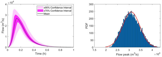 For the dam location, the uncertainty visualization is depicted in Figure 8: uncertainty band with respect to time (left) and normal distribution fitted to the results (right). The mean was calculated equal to m = 30,919.89 m3/s, whilst the standard deviation was equal to s = 3712.49 m3/s.
