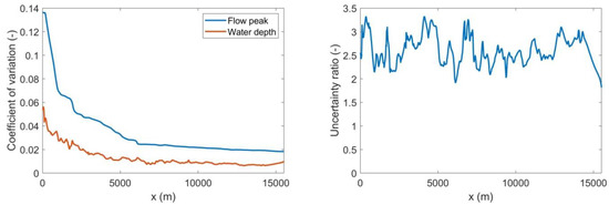 The coefficient of variation, namely the ratio s/m, can be used as a metric for the uncertainty to the model results due to the dam breach parameters. In order to investigate the propagation of this uncertainty, this coefficient was calculated along the Tavronitis River and is depicted in Figure 11, for both peak flows and maximum water depths (left). Besides, the ratio of the flow peak uncertainty to the maximum water depth uncertainty was also calculated (Figure 11, right).