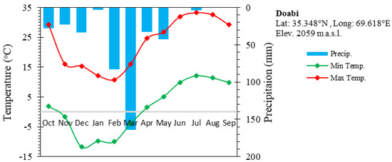 This study was focused on the Panjshir sub-basin of the Kabul basin (Figure 1). The sub-basin covers an area of about 3540 km2, as calculated by using the Advanced Spaceborne Thermal Emission and Reflection Radiometer (ASTER) Global Digital Elevation Model (GDEM) product [55]. Its mean elevation is approximately 3498 m a.s.l., as calculated from the hypsometric curve, and its maximum elevation is around 5694 m a.s.l. (Figure 2). The Panjshir River originates in the high mountainous region of the Hindukush characterized by seasonal snow cover and glaciers, and it joins the Kabul River below its confluence with the Ghorband River on the Shamali Plain. Annual discharge from the Panjshir sub-basin, including the Ghorband sub-basin, to the Kabul River is second largest, after the Kunar River. In the Panjshir sub-basin, maximum precipitation is observed during the winter months (February and March), and the mean total annual precipitation measured at Doabi climate station is about 336 mm. The maximum summertime temperature is observed in July (average, 24 °C), and the average minimum wintertime temperature is approximately –17 °C (Figure 3). Because of the intricate terrain, there is a large spatial variation in the amount of precipitation over the course of a year. The climatic conditions of the Panjshir sub-basin generally allow one crop to be grown each year with occasional crop rotation [56]. The estimated mean annual actual evapotranspiration is about 450 mm [57].