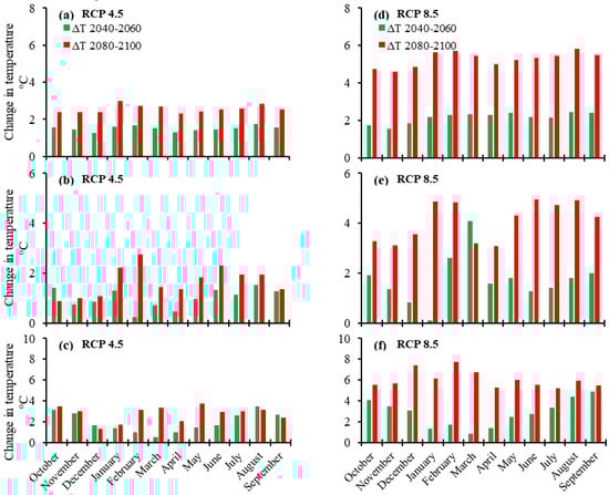 Projected monthly temperature changes during 2040–2060 and 2080–2100: (a) average, (b) lower, and (c) higher under RCP 4.5; and (d) average, (e) lower, and (f) higher under RCP 8.5.