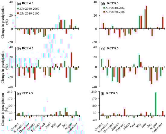 Projected monthly precipitation changes during 2040–2060 and 2080–2100: (a) average, (b) lower, and (c) higher under RCP 4.5; and (d) average, (e) lower, and (f) higher under RCP 8.5.