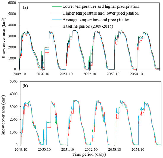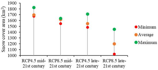 Average, lower, and higher temperature and precipitation climate change scenarios were used to simulate future daily SCAs. Using average temperature and precipitation scenarios during 2049–2055, SM simulations projected that the average annual SCA will decline by 7% (132 km2) under RCP 4.5, and by 12% (210 km2) under RCP 8.5 (Figure 6). Using lower temperature and higher precipitation scenarios, SM simulations projected a decrease in the annual average SCA of 0.15% (3 km2) under RCP 4.5 and of 10% (192 km2) under RCP 8.5 during 2049–2055. Similarly, based on higher temperature and lower precipitation scenarios, the annual average SCA was projected to decline by 8% (152 km2) and 15% (283 km2) under RCP 4.5 and 8.5, respectively (Figure 6).