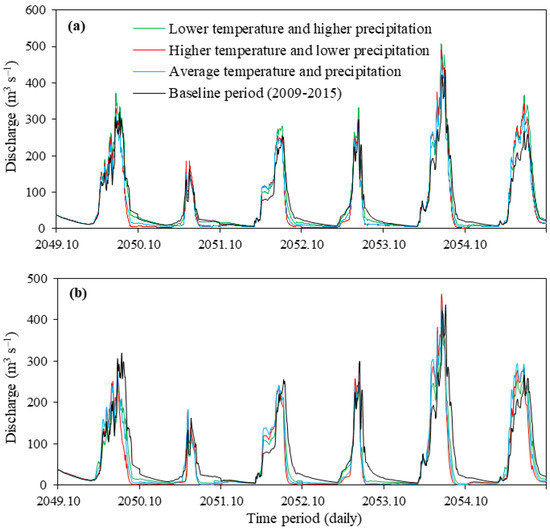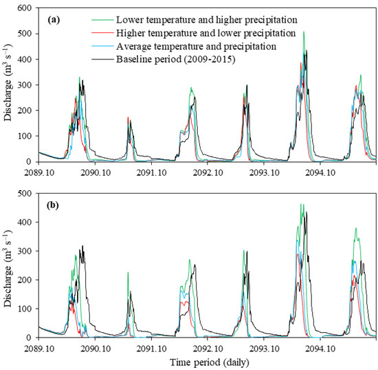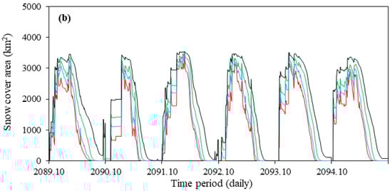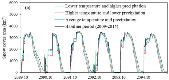 In general, SCA was reduced across all scenarios. The projected increases in winter temperature and decreases in winter precipitation caused the wintertime snow cover in the study area to decline [18], and this decline will likely affect the timing and rate of snowmelt. The extent of glacier ice and the number of snow cover days are expected to decrease or even vanish during the 21st century [81]. In addition, basins with low percentages of glacier cover will be transformed from snow-dominated to rain-dominated, and this transformation is expected to shift the main runoff season from summer to winter [81].