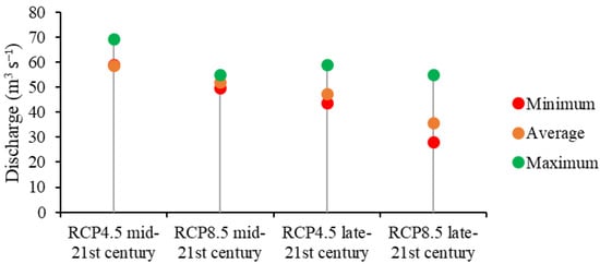 In the present study, eight GCMs were used to obtain temperature and precipitation in the future climate under RCP 4.5, a medium stabilization scenario, and RCP 8.5, a very high baseline emission scenario [75]. Figure 4 and Figure 5 show the average, lower, and higher temperature and precipitation changes, respectively, projected by the GCMs for the mid-21st century (2040–2060) and late 21st century (2080–2100). Temperature is projected to increase under both RCPs, whereas precipitation is projected to decrease in the future with respect to the baseline period (2000–2020). The mean monthly projected temperatures of all GCMs under the RCP 4.5 and 8.5 emission scenarios show increases in all months during both 2040–2060 and 2080–2100.