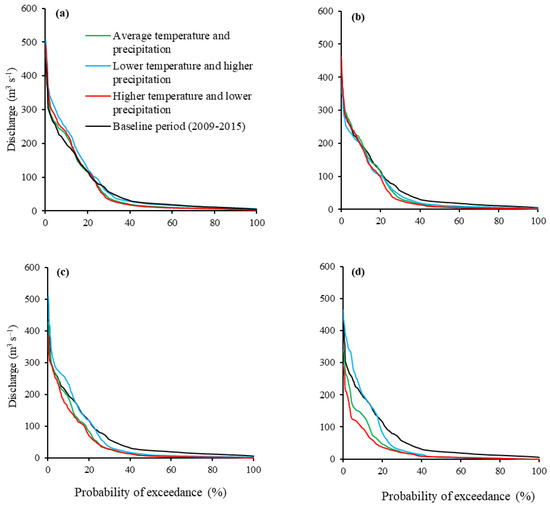 A decrease of 25% (16 m3 s–1) under RCP 4.5 and as much as 43% (27 m3 s–1) in the annual average discharge during 2089–2095 was projected under RCP 8.5, based on the average temperature and precipitation scenarios and the resulting SCAs (Figure 10). Based on the lower temperature and higher precipitation scenarios, the projected decreases were about 7% (4 m3 s–1) and 17% (11 m3 s–1) under RCP 4.5 and 8.5. The largest projected reductions in annual average discharge during the late 21st century of approximately 31% (20 m3 s–1) under RCP 4.5, and 55% (35 m3 s–1) under RCP 8.5, were obtained by using the higher temperature and lower precipitation scenarios.