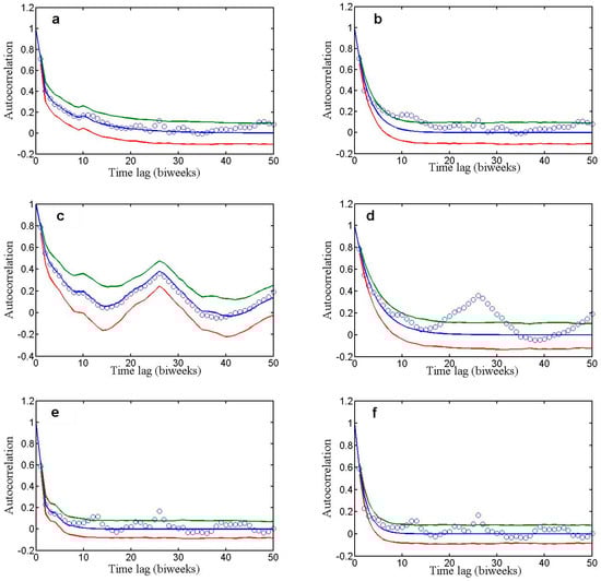 Autocorrelation functions (ACFs) of the original time series and AR (1) fitted processes and better fitted ARMA processes. In x-axes is the time lag (1 unit = two weeks). Circles are the ACFs of the time series (transformed as explained in the text), the blue line the ACF of the fitted process, and red and green lines the 95% confidence limits of the fitted process ACF. (a) Discharge AR (9), (b) discharge AR (1), (c) sodium AR (34), (d) sodium AR (1), (e) sulfate AR (3), (f) sulfate AR (1).