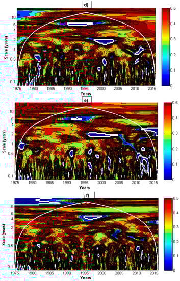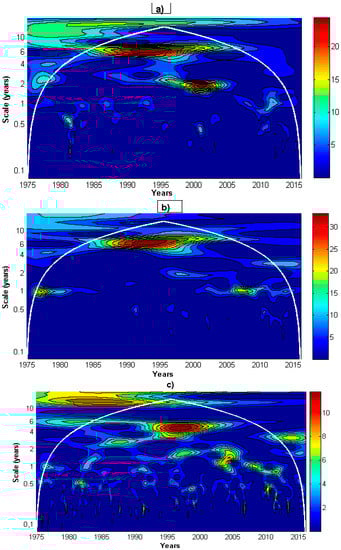 An extensive literature exists for a comprehensive explanation of wavelet transform and related topics (wavelet spectra and wavelet coherence). Outstanding examples of accessible tutorials with geophysical and climatic applications are found in the literature ([1,21,30]). Aguiar-Conraria and Soares [24] give a nice introduction to the wavelet topic even though it applies to economics. A brief overview is given below.