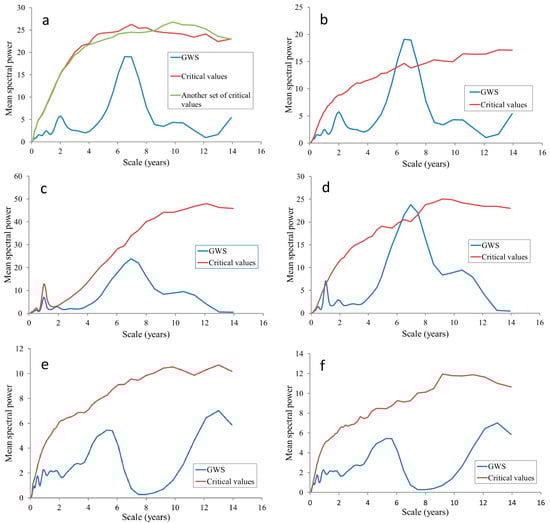 As discussed in the introduction, the multiple testing problem has to be considered when dealing with significances [30,34]. The use of GWS and GWC spectra offers a way of overcoming these problems. Both spectra are obtained from the WPS and the WCS respectively by averaging spectral power at each scale over the entire time interval of the time series. When the GWS (or the GWC) is bigger (at a value of scale) than the critical value obtained with the reference stochastic process, we accept that it is an indication of the existence of a deterministic effect on the time series at this scale. The disadvantage of this procedure is that we lose the information about the time evolution of the fluctuations of the series, which is one of the main features of wavelet analysis, but the information on the series fluctuation at different time scales is preserved. By using averaging to discover significant features in the wavelet spectra, we are also taking a conservative approach, as possibly significant areas (t, s) in the WPS or GWC spectra could result in a non-significant average in the GWS or WCS spectra.
