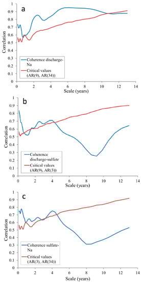 WCSs of discharge and sodium, discharge and sulfate, and sulfate-sodium have been calculated (Figure 5) from the wavelet coherence spectra (Figure 6). Discharge and sodium are particularly strongly coherent at scales of more than four years, but significant global coherence exists between both variables at practically every scale. Sulfate and discharge are coherent at scales smaller than four years (except around one year), with three peaks at 1.6, 2.5, and 3.7 years. In this case, and contrary to the sodium, there is no coincidence with the main peaks in GWSs of sulfate and discharge.