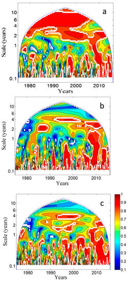 Global coherences and wavelet coherence spectra (WCSs) for (a) discharge-sodium, (b) discharge-sulfate, and (c) sulfate-sodium. y-axes represent coherences (between 0 and 1) and x-axes scales (in years).