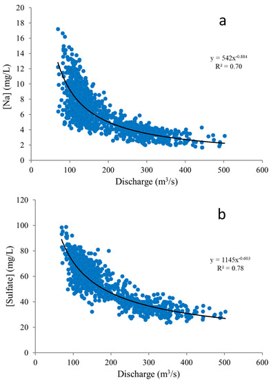 (a) Sodium and (b) sulfate concentration-discharge relationships.