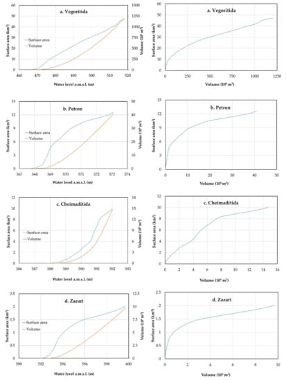 Water level–surface area–volume curves (left) and surface area–volume curves (right) in Lake Vegoritida, Petron, Cheimaditida and Zazari (source data: []).