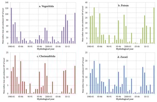 where ΔV is the variation in the volume of water stored in the lake during the time interval (m3), Qin is the surface inflow into the lake from the catchment area during the time interval (m3), P is precipitation and E is evaporation in/from the lake’s surface during the time interval, respectively (m3), Gin is the groundwater inflow and Gout is the groundwater outflow during the time interval (m3), Qusers is the water outflow to water users, and Qout is the surface outflow during the time interval (m3). Herein, a monthly time interval is considered. The hydrological model, i.e., the combination of the rainfall–runoff model and the water balance model, was successfully calibrated, according to the water level measurements in Lake Petron, Cheimaditida and Zazari for the period 2012–2015 and in Lake Vegoritida for the period 1980–2015, resulting in a reliable estimation of the water inflow into the lakes from the hydrological catchment area []. Figure 3 shows the annual water inflow into the four lakes from their subcatchment areas for the hydrological years 1980–1981 until 2014–2015, considered as the sum of the surface inflow into the lake from the subcatchment area (Qin) and the surface outflow from the upstream lake (Qout).