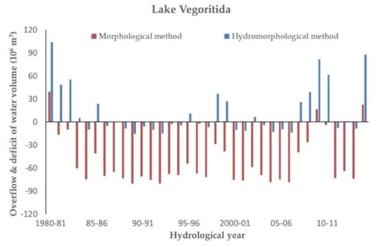 - Figure 4 shows the hydrological evaluation of the two methods in Lake Vegoritida. According to the morphological method, for 32 out of 35 years a deficit existed, and only for 3 years there was an overflow of water. In the case of the hydromorphological method, deficit occurred for 20 years and overflow for 15 years, which means that overflow has increased considerably compared to the morphological method.