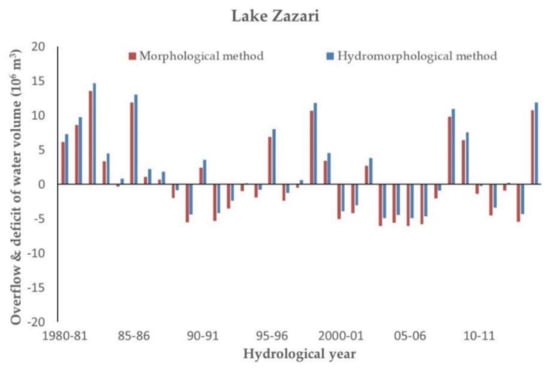 - Figure 7 shows the hydrological evaluation of the two methods in Lake Zazari. According to the morphological method, deficit was observed for 20 years and overflow for 15 years, while in the case of hydromorphological method, deficit was observed for 16 years and overflow for 19 years.