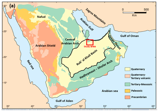 - Powers, R.; Ramirez, L.; Redmond, C.; Elberg, E.L., Jr. Geology of the Arabian Peninsula—Sedimentary Geology of Saudi Arabia; Professional paper 560-D; USGS: Reston, VA, USA, 1996.