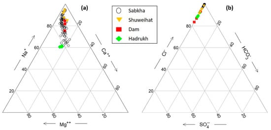 Triangular plots of (a) major cations and (b) major anions prepared from concentrations in equivalent units of water samples collected from different aquifers in the sabkha Matti area.